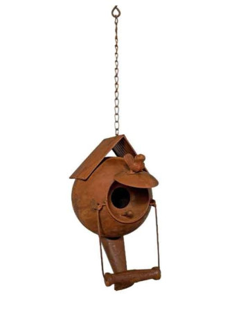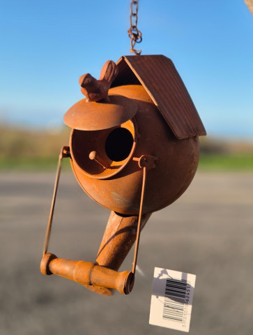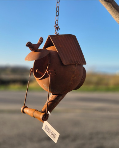 Magnifique suspension théière oiseau en fer rouillé vintage, vous lui trouverez une belle utilité dans votre jardin..