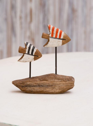 Deux poissons rouge et noir sur une base en bois, n'hésitez pas à les assortir avec le rete de la collection pour un effet mer réussi..